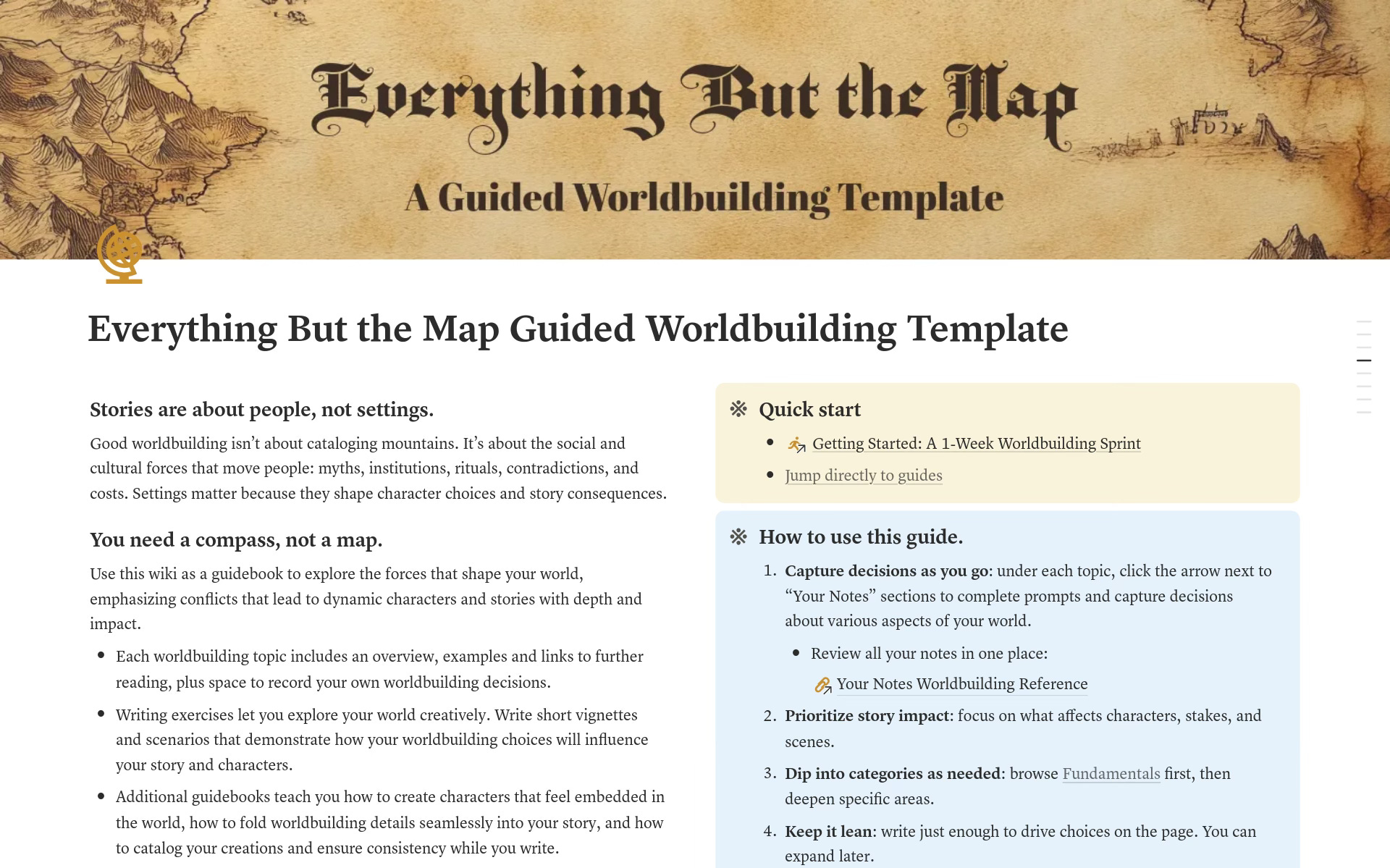 A guided worldbuilding system for fantasy writers that focuses on story-driving forces—not exhaustive catalogs—to build layered, meaningful worlds.